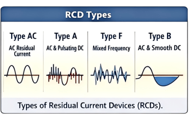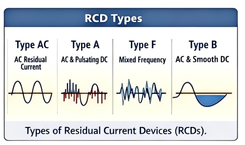 Residual Current Devices (RCDs)—also called Residual Current Circuit Breakers (RCCBs) or Ground Fault Circuit Interrupters (GFCIs)—are classified by their ability to detect different waveforms and current types.