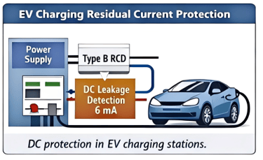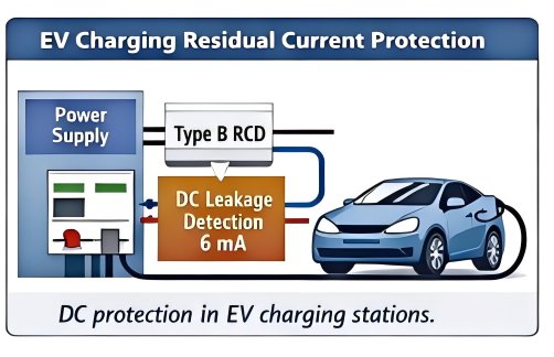 In EV charging, combine RCDs (such as Type A with DC 6mA detection or Type B) to meet regulatory safety requirements.