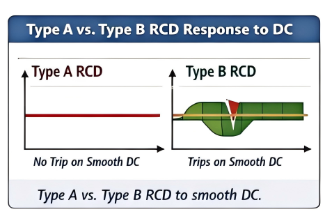 Image: Comparison graphic showing Type A vs. Type B RCD response to smooth DC.